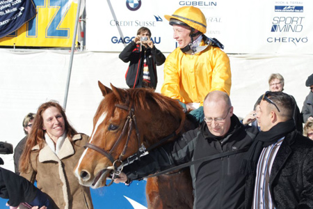| Manchmal werden Träume wahr. Fast auf den Tag genau neun Monate nach seiner tragischen Operation (Siehe dazu den Bericht) triumphiert Raneb anlässlich des White Turf Meetings vom 10. Februar 2008 in St. Moritz im Grandprix Prestige mit seinem ersten Sieg. |