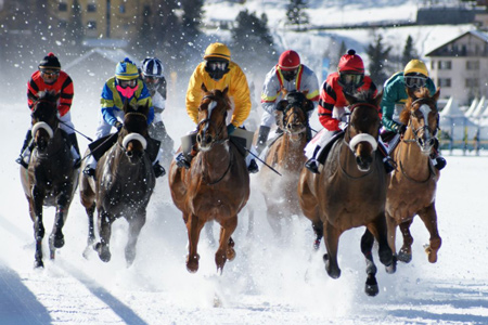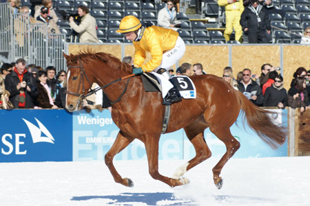 | In St. Moritz trat er im Grandprix Prestige mit einer Quote von 11.5:1 als der grosse Aussenseiter an. Gegen ihn sprachen bei den Wettern mehrere Faktoren. Es waren neben seiner Operation sein Alter von nur gerade vier Jahren, seine Unerfahrenheit mit nicht mehr als bisher sechs Rennen, die Steherdistanz von 1900 Meter in St. Moritz auf Schnee und nicht zuletzt seine Gegnerschaft bestehend aus siegesgewohnten Routiniers. Aus unserer Sicht sahen wir trotzdem Chancen für ein gutes Resultat. Vier Wochen zuvor lief er in Arosa zum Teil gegen die gleichen Gegner mit einem zweiten Platz ein gutes Rennen. Dazu kam, dass wir ihn in den letzten Wochen optimal und fokussiert nach Plan vorbereiten konnten. In jeder Phase des Trainings zeigte er eine aufsteigende Leistungstendenz. Ein weiterer Plusfaktor war sicher auch die grosse Bahn in St. Moritz selber, die seiner raumgreifenden Aktion entgegenkam. |