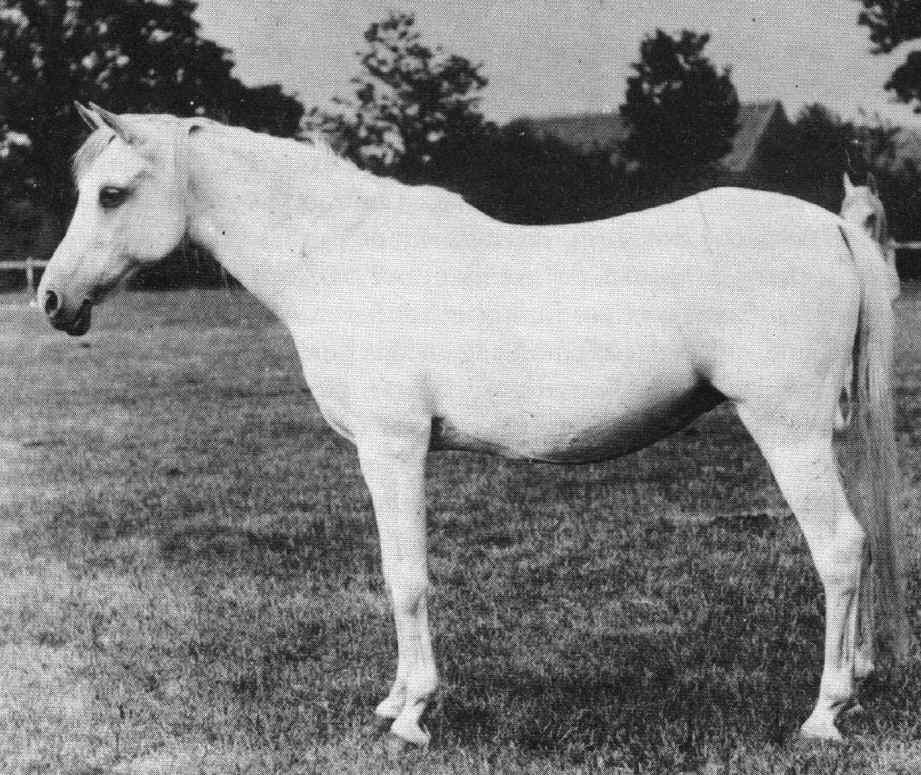 Die Stute verfügt über ein grosses, gut angesetztes Auge, eine ausgeprägte Ganasche, einen eher langen Kopf und nicht allzu feiner Nasenpartie. Weitere Ausprägungen sind ihr langer, hoch angesetzter Hals, ein ausgeprägter Widerrist und langer Oberarm. Die Rückenpartie ist etwas lang und die Kruppe kräftig, lang und leicht abfallend. Das Fundament ist korrekt mit einem tief angesetzten Sprunggelenk. Alles in allem eine exzellente Stute im Reitpferde Typ. Wo sind sie heute geblieben, diese arabischen Pferde? Auf Schauen sieht man sie nicht mehr, und wenn sie dort auftreten würden, wären sie nicht in den ersten Reihen zu finden. |