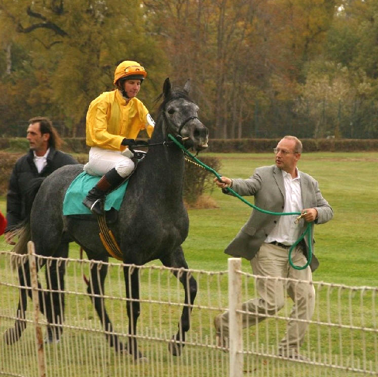 galoppieren. In lockerem Kanter ging's auf den Aufgalopp mit seiner Reiterin in den Rennfarben von "Golden Arabians".Schon von Weitem sichtete "Prinzli" die grossen Tribünengebäude und lauschte den Platzlautsprecher, etwas, was er bisher noch nie gesehen und gehört hatte. Mit etwas Seitenwind passierte er diese "komischen Dinger" und galoppierte erleichtert runter zu der Startmaschine.