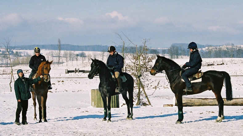 Unten Fränzi Aeschbacher mit kalten Füssen und den drei Rennpferden