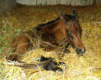 | Das am 22. Februar geborene DAHESS Fohlen hat sich in seinen ersten drei Wochen gut entwickelt und kann im Aussehen seinen Vater DAHESS, 28-facher Rennsieger, nicht verleugnen. Seine stolze tunesische Mutter KAHLOUCHA, 5-fache Rennsiegerin, lässt die Kleine bereits an den Hafer und ans Heu. | |
