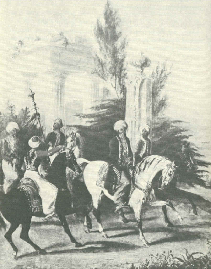 left: Painting of De Portes showing Abbas Pasha and entourage. Reportedly Abbas Pasha was murdered by two of his inferiors in 1854. He was known to be very brutish towards his entourage. |