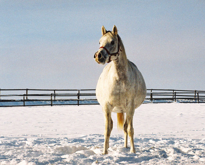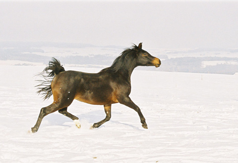 | Our dark lady Nil Tahani (Versal x Tiffaha von Jamil) shows herself powerfully in her bright winter coat. As former international race winner and National champion mare and mother of race champion stallion Nil Bedouin (Barour de Cardonne x Nil Tahani von Versal) she has good reasons to be proud. |