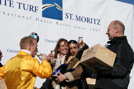 ![]() Bild links: Raneb und Markus Kolb im Zieleinlauf mit einem leichten Sieg vor der eindrücklichen Publikumskulisse in St. Moritz mit den 13'000 Zuschauern. Foto: www.scarletti.ch |