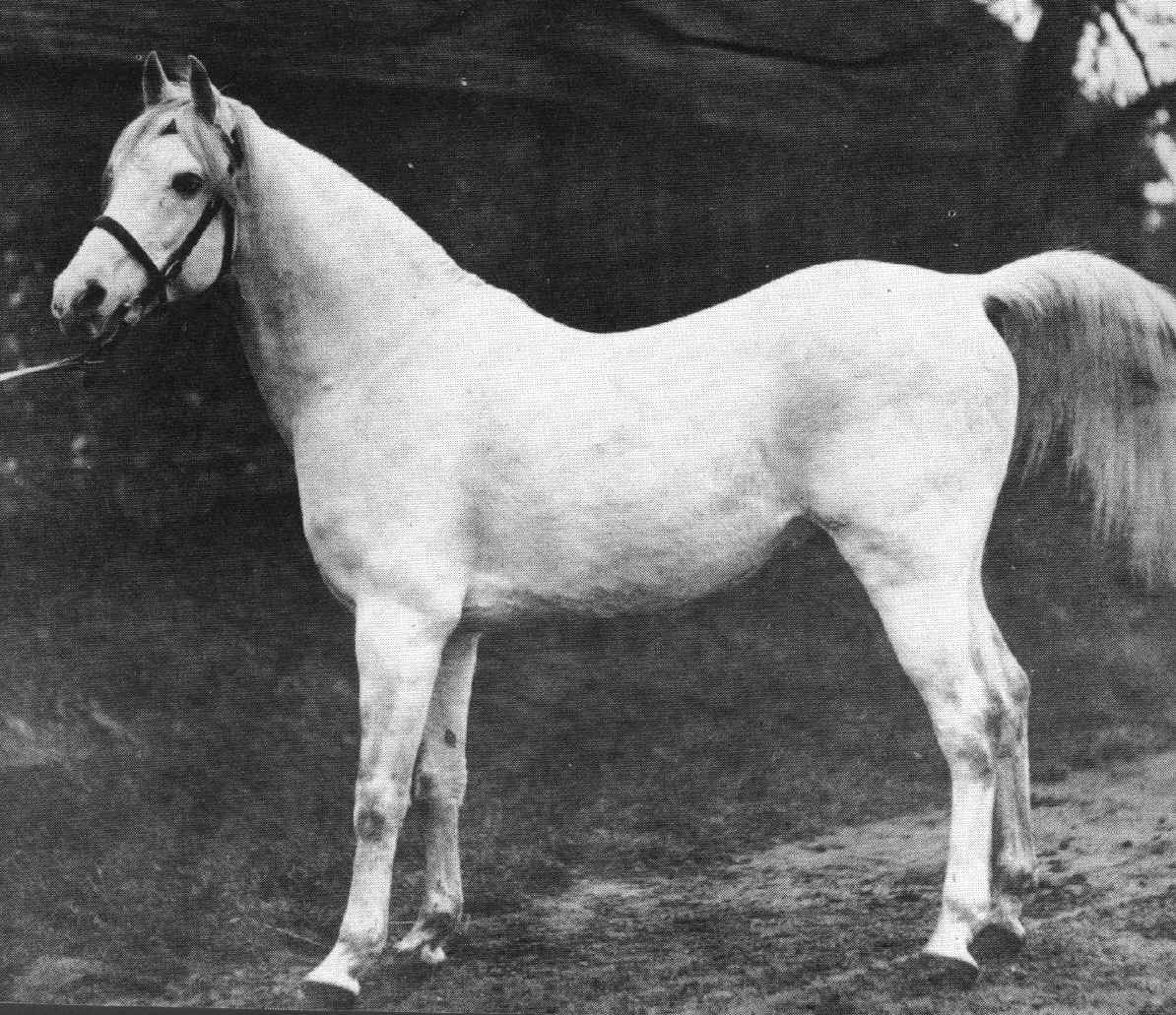 Die Stute verfügt über ein grosses, gut angesetztes Auge, eine ausgeprägte Ganasche, einen eher langen Kopf und nicht allzu feiner Nasenpartie. Weitere Ausprägungen sind ihr langer, hoch angesetzter Hals, ein ausgeprägter Widerrist und langer Oberarm. Die Rückenpartie ist etwas lang und die Kruppe kräftig, lang und leicht abfallend. Das Fundament ist korrekt mit einem tief angesetzten Sprunggelenk. Alles in allem eine exzellente Stute im Reitpferde Typ. Wo sind sie heute geblieben, diese arabischen Pferde? Auf Schauen sieht man sie nicht mehr, und wenn sie dort auftreten würden, wären sie nicht in den ersten Reihen zu finden. |