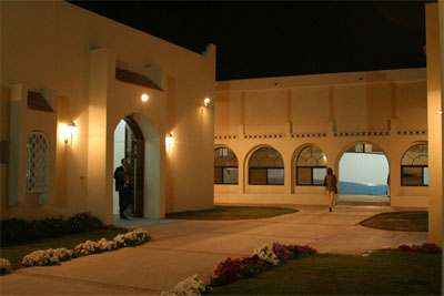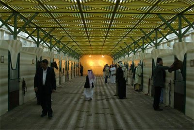 polnischer und russischer Abstammung werden hier in hoher Qualität gezüchtet.Bild links: Stallungen auf Al Shaqab. Im hinteren Gebäude befindet sich das Indoor-Swimming Pool zum Training der Schau- und Endurance-Pferde. |