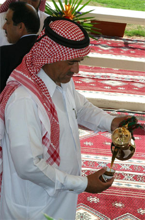 | Die mit orientalischen Teppichen ausgelegte Tribüne spendete uns angenehmen Schatten während der internationalen Vollblutaraberschau. Dabei wurde uns während des ganzen Tages der bittere und geheimnisvoll riechende, arabische Tee serviert, der uns sofort jeglichen Durst nahm. |