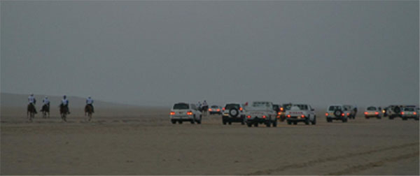 um 5 Uhr kurz nach dem Start:Eine Karawane von Pferden, Reitern und Geländefahrzeugen begibt sich in die Weite der von der Nacht noch dunkel gefärbten Wüste. |