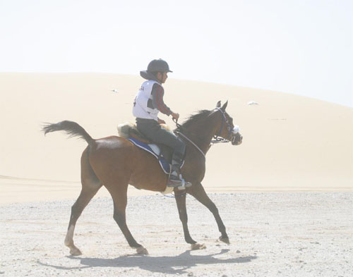 vor Mittag:Das Thermometer steigt gegen 30 Grad. Bei einem Blick auf die Pferde, die in der endlosen, kargen Salzwüste Qatars bereits über 80 km im Galopp unterwegs sind, wird uns der Ursprung des Vollblutarabers bewusst und wir verstehen, warum gerade das arabische Pferd so besonders zäh, genügsam, hart und leistungsbereit ist. |