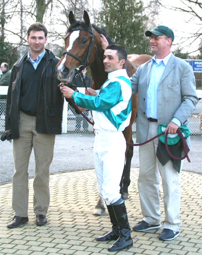 | Kalansar mit Fränzi und Urs Aeschbacher auf dem Führring und mit Jockey Eric Wehrel beim Aufsteigen. |