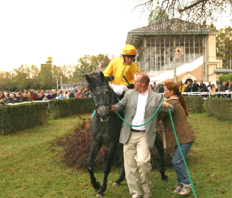 galoppieren. In lockerem Kanter ging's auf den Aufgalopp mit seiner Reiterin in den Rennfarben von "Golden Arabians".Schon von Weitem sichtete "Prinzli" die grossen Tribünengebäude und lauschte den Platzlautsprecher, etwas, was er bisher noch nie gesehen und gehört hatte. Mit etwas Seitenwind passierte er diese "komischen Dinger" und galoppierte erleichtert runter zu der Startmaschine.