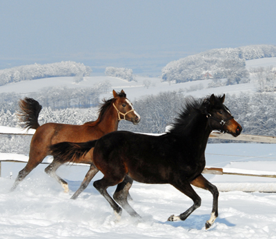 Jungpferde tummeln sich im Schnee.Auf den folgenden Seiten ein paar Winterimpressionen und Infos über unsere Pferde im Schnee. Zum Bericht klicken Sie hier: Links: Vollblutfohlen Morgaine der Familie Aebi vorne und dahinter Nil Anablue Foto: Nile Arabians |