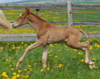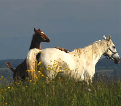 ![]() "Born to run". Fohlen brauchen grosse, möglichst flache Weiden, damit sich ihre Sehnen, Bänder und Gelenke beim täglichen Galoppieren optimal und ohne Fehlstellungen entwickeln können. |
