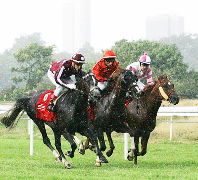 Nil Ishan Ibn Al Sakbe lang.links: hart umkämpfter Einlauf im Platzregen von Frankfurt mit Al Anqa links, Nil Ishan Ibn Al Sakbe in der Mitte und Terach El Samawi an den Rails (Foto Reini Kolb) |
