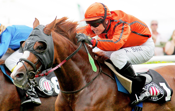 Gegengerade schnell drei, vier Längen vom Feld ab.links: Jockey Andre Best bei seinem 909. Siegesritt auf Nil Ishan Ibn Al Sakbe.