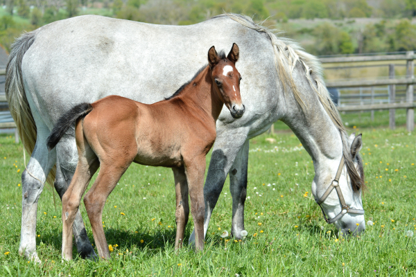 | Bild: Aqif du Nil mit seiner Mutter Anissina du Nil im Alter von zwei Wochen. Photo Haras du Nil | |