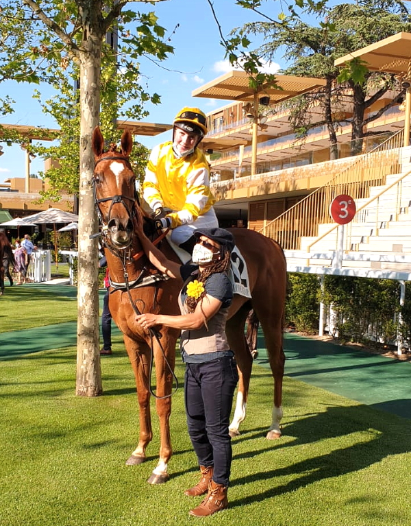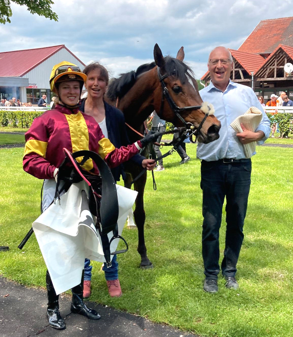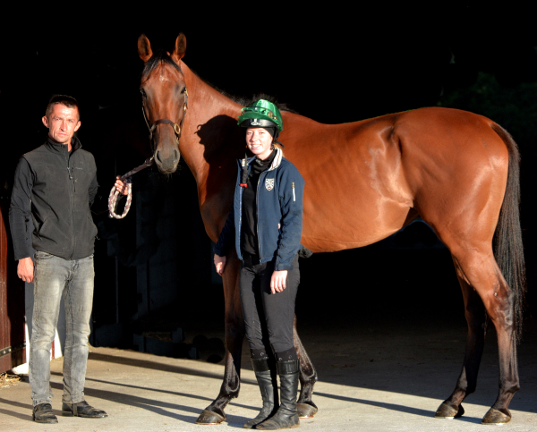 Bild: KHAN DU NIL nach seinem Sieg mit Trainerin Franziska