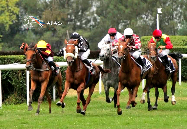 | Bild: Einlauf im Prix Mushrae, Gruppe III PA für 3-jährige in Toulouse mit dem Schimmel ALIBABA DU NIL unter Jordan Plateaux an dritter Stelle in den Farben Bordeauxrot – Gelb | |