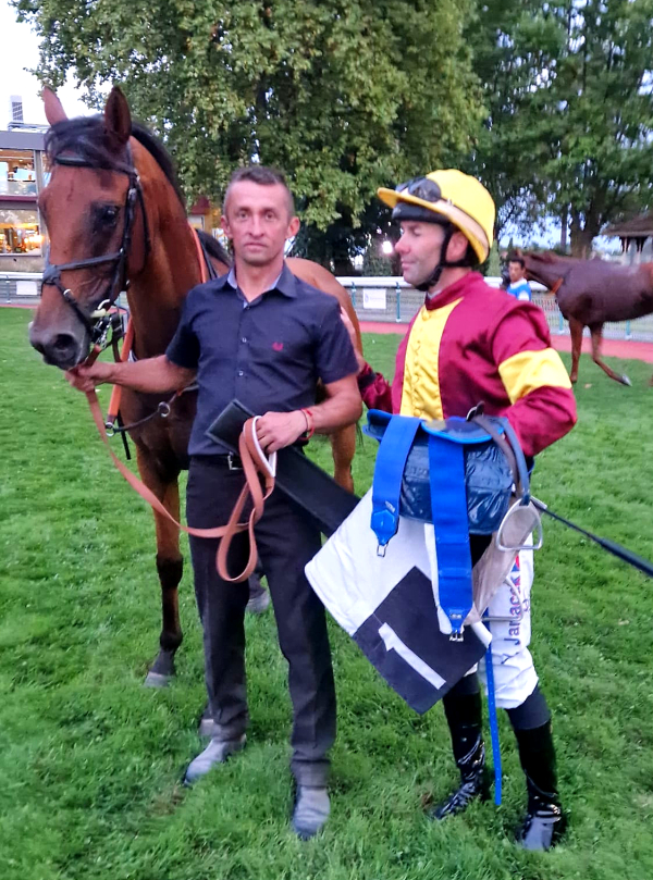 nach dem Rennen mit Jockey Vaclav Janacek und seinem Arbeitsreiter Peter Elias |