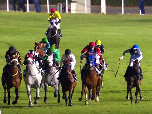 | Bild: Startnummer 11, MAIMOUN RS, 2018 (Kong x Kahloucha von Zeidoun) mit Sandro Paiva klassiert sich als Dritter in einem Sprint Rennen über 1'000 Meter auf der Rennbahn von Al Ain in Abu Dhabi. | |