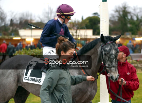 Bild: TOPY’SIM auf dem Führring in Cagnes-sur-Mer unter Jockey Augustin Madamet, Züchterin Audrey Lendel und Trainer Nicolas Guilbert |