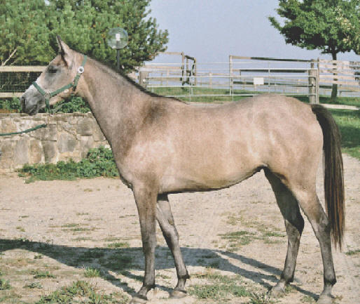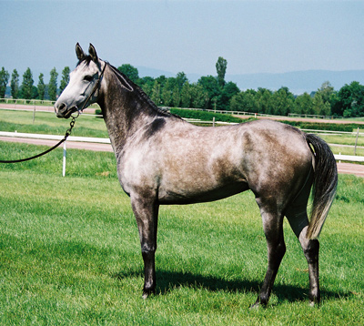 Gang und stammt aus bester französischer Leistungszucht.Ihre Mutter Kadjouna de Nerak geht auf die 1880 durch das französische Staatsgestüt Pompadour nach Frankreich importierte Stute ZENAB aus der Familie der EL Hamdanie zurück, die heute zu den zehn besten Leistungslinien Frankreichs zählt. Ihr Vater, der Dormane Sohn Darike, weist mit 9 Siegen und 13 Platzierungen aus 24 Starts eine aussergewöhnliche Rennleistung aus und war im Jahr 1995 bestes arabisches Rennpferd in Frankreich. (Foto 4-jährig im Renntraining) Mehr Bilder: |