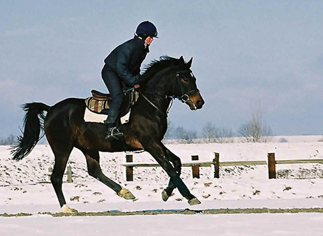 | The young stallion Nil Bedouin (Barour de Cardonne x Nil Tahani) in a slow canter on snow. He loves wintriness and is extra fresh on those days always ready to cut a caper. | |